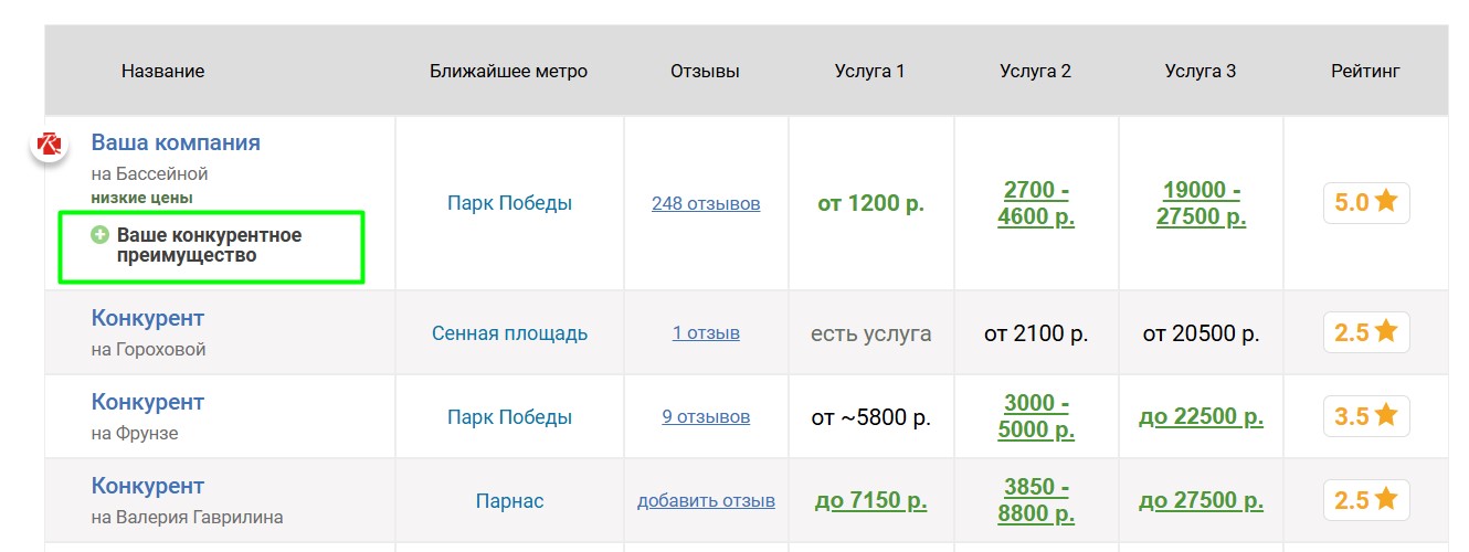 Если компания имеет конкурентные преимущества, мы можем их опубликовать на странице школы и показывать в таблицах в соответствующих страницах. Преимущества можно гибко настраивать для разных услуг. Правильная публикация преимуществ существенно увеличивает интерес клиентов, так как выделяет школу в таблицах и показывает, почему следует обратиться именно туда.
